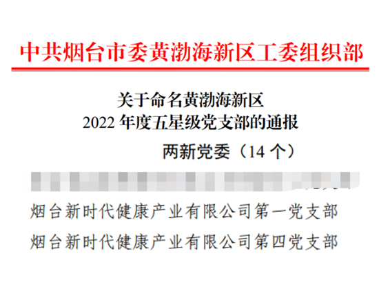 为持续深化党支部标准化规范化建设,全面提升新时代党支部和党员队伍建设质量,2022年黄渤海新区在全区实施了“五星联创”工程,日前,新时代集团所属烟台健康公司第一和第四党支部以突出的表现获评“2022 年度黄渤海新区五星级党支部”荣誉称号。