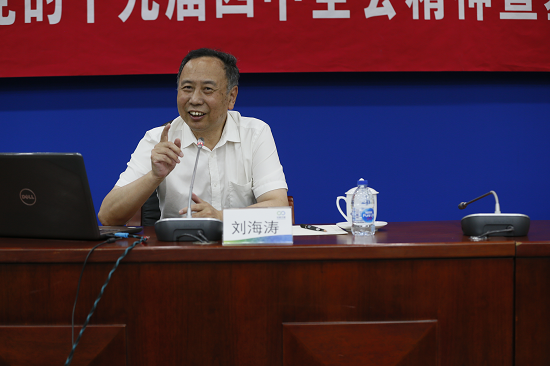 下午,中央党校(国家行政学院)副教育长、中国马克思主义研究基金会理事长刘海涛教授从党的十九届四中全会召开的重大意义、中国特色社会主义制度和国家治理体系发展历程、主要特点、优势以及未来的发展等方面,全面深入系统地解读了党的十九届四中全会精神。