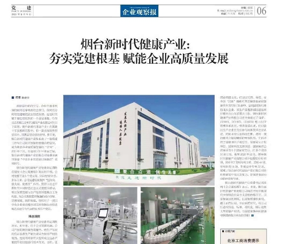 8月9日,《企业观察报》以《烟台新时代健康产业公司——夯实党建根基 赋能企业高质量发展》为题,专版报道新时代健康产业(集团)有限公司子公司——烟台新时代健康产业公司(以下简称“烟台健康公司”)运用党建赋能企业经营发展的经验成果。
