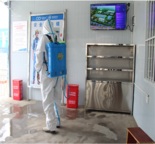 姚店项目制定了扬尘治理措施,严格落实“七个到位,六个百分百”要求。施工现场配有环境监测系统,同时配备雾炮机及喷洒两用雾炮车各一台,每天由专人不定时进行喷洒;采用绿色密目网覆盖所有裸土;临时道路利用混凝土硬化,排水通畅并设专人不定时清扫;原材料及半成品按总平面布置图堆放,用防雨布覆盖,及时整理清运废弃材料;车辆出入口设有自动洗车台,可对车辆进行及时冲洗。