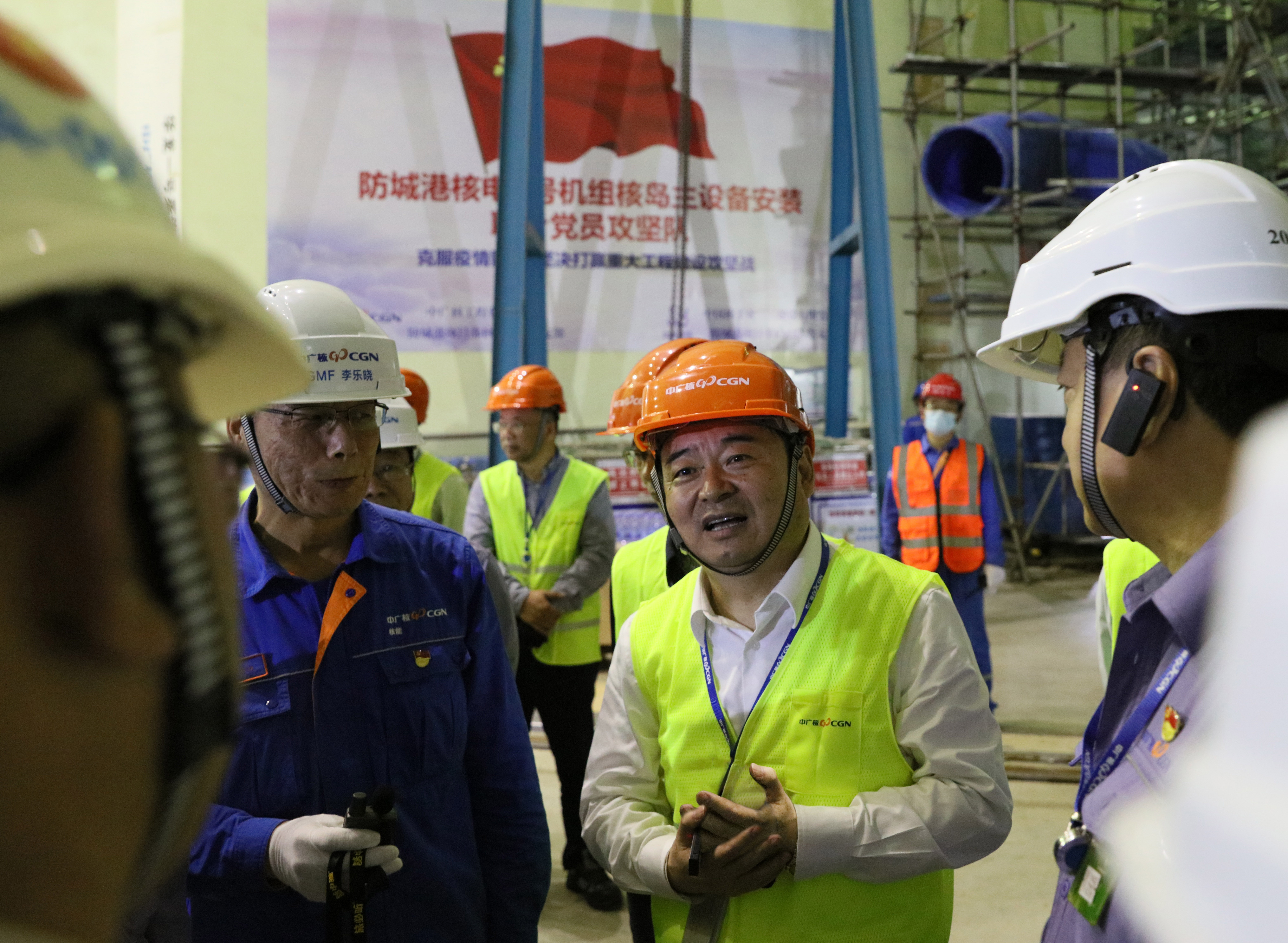 郝鹏深入中广核防城港核电基地,听取了防城港核电项目整体规划建设汇报,深入核电主控室、二期建设现场,实地查看核电机组建设及运行情况,与企业负责人、一线职工亲切交流,对大国重器“华龙一号”的建设及运行工作充分肯定。他强调,发展核电是优化我国能源结构、缓解环境污染、保证能源安全的需要,要统筹发展和安全,坚持安全第一、质量第一、追求卓越的原则,健全完善全过程可追溯的安全监督机制,牢牢把住安全质量关。要始终坚持党的领导加强党的建设,在加强党的政治建设、推动党建与业务深度融合、全面从严治党上持续用力,以高质量党建引领高质量发展,努力建设技术领先、安全高效、公众信赖的一流清洁能源企业。