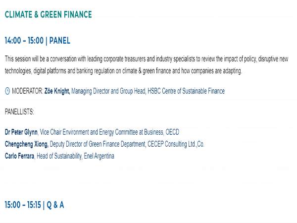本次研讨会旨在探讨未来全球价值链在全球经济、创造就业、分享繁荣、促进创新和吸引投资方面的关键作用,并针对全球价值链如何发展以应对贸易保护主义、气候变化和数字化等带来的挑战提供一系列政策建议。在“气候金融及绿色金融”研讨会上,中节能咨询代表向与会者介绍了中国绿色金融体系建设的背景,尤其是在推动应对气候变化投融资方面的进展,并在推进金融机构气候风险主流化、促进金融机构气候金融产品创新、推动企业参与气候治理等方面提出了建议。