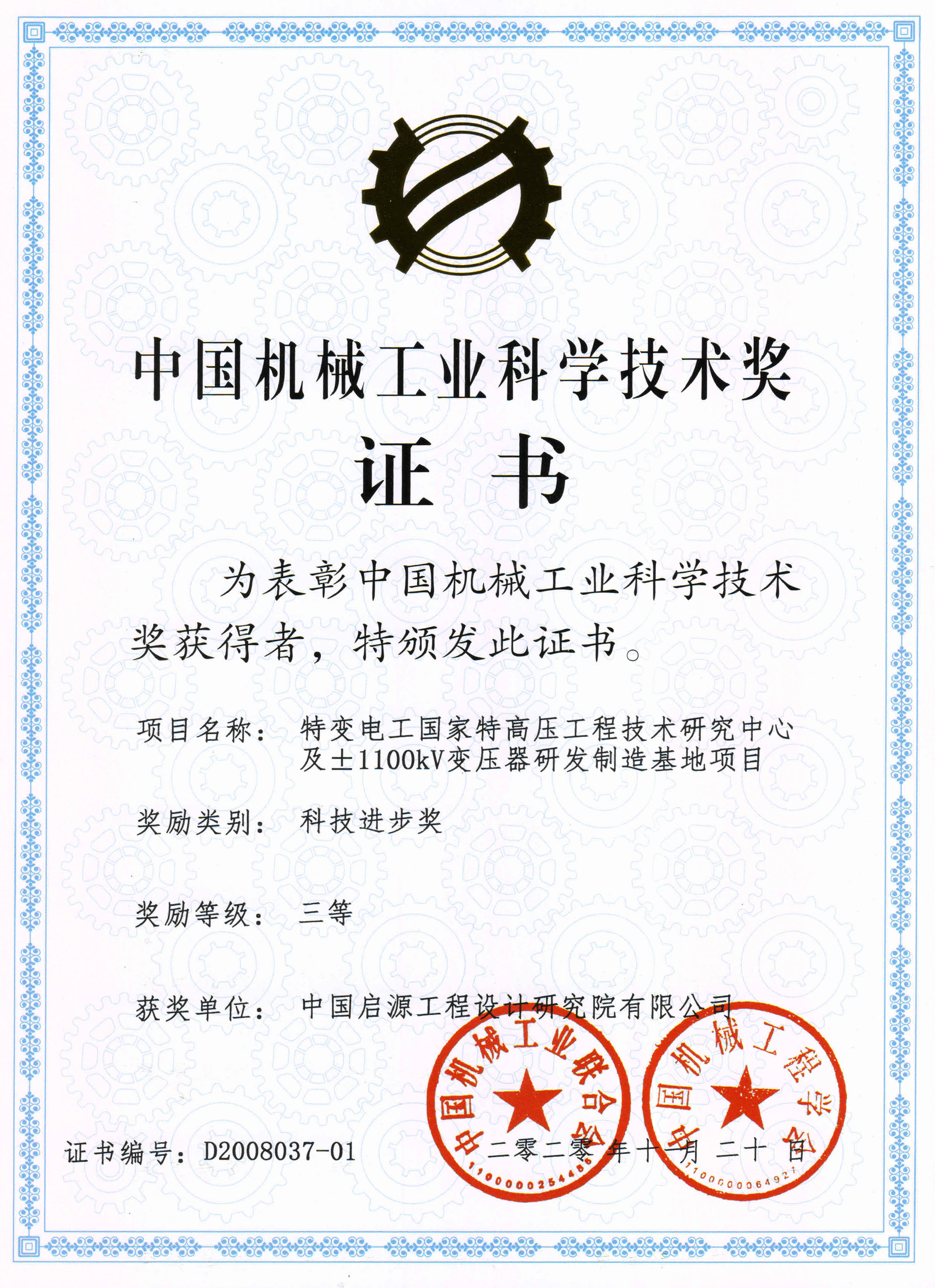 中机工程(西安)启源咨询设计有限公司完成的“特变电工国家特高压工程技术研究中心及±1100kV变压器研发制造基地项目”荣获三等奖;