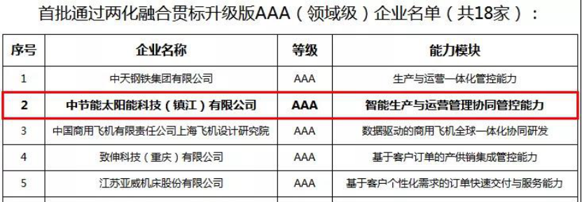 近期,由工业和信息化部、全国工商联、江苏省人民政府共同主办的第二届两化融合暨数字化转型大会在江苏苏州召开,现场发布了首批两化融合管理体系升级版贯标达标企业名单,太阳能镇江公司首批通过全国首批18家AAA认证企业。