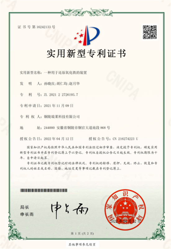 坚持成果培育转化。持续强化对“双平台”(瑞莱科技公司拥有安徽省企业技术中心安徽省工程技术研究中心)的维护,组织实施阶段性科研任务,提前完成安徽省企业技术中心2022年度评价工作;积极开展铜陵市“1155”创新创业专业技术人才团队年度考核以及“2021年度能效领跑者”项目申报。以专利为突破口,加强科技成果的培育和转化,今年以来,完成2项安徽省科技成果登记,完成4项专利申报(其中发明专利2项,实用新型专利2项),成功获得实用新型授权专利2项,累计专利总数达78项,遥遥领先行业其他企业。同时努力推动专利成果在公司生产经营中的应用,大大提升了公司在激烈市场中的竞争力。2022年第一季度瑞莱科技公司全面完成了各项生产经营指标,成功实现了“开局稳”、“开门红”。