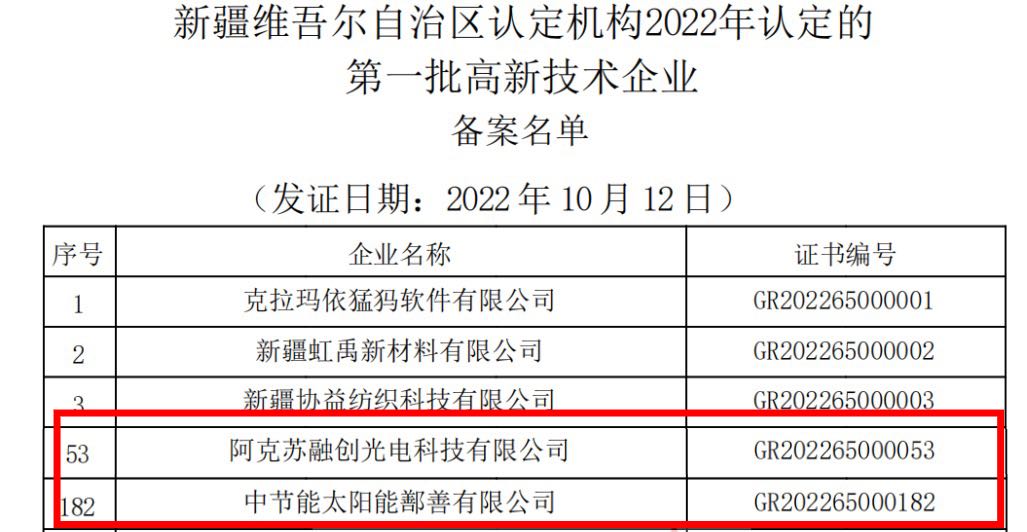 近日,全国高新技术企业认定管理工作领导小组办公室发布了《新疆维吾尔自治区认定机构2022年认定的第一批303家高新技术企业备案名单》,太阳能新疆区下属中节能太阳能鄯善有限公司、阿克苏融创光电科技有限公司2家公司被认定为2022年第一批国家高新技术企业。