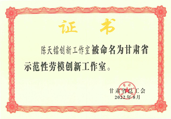 2022年8月,甘肃省总工会发布《关于命名第四批甘肃省示范性劳模创新工作室的决定》(甘总工法〔2022〕50号),命名兰冶院陈天镭创新工作室为“甘肃省示范性劳模创新工作室”。