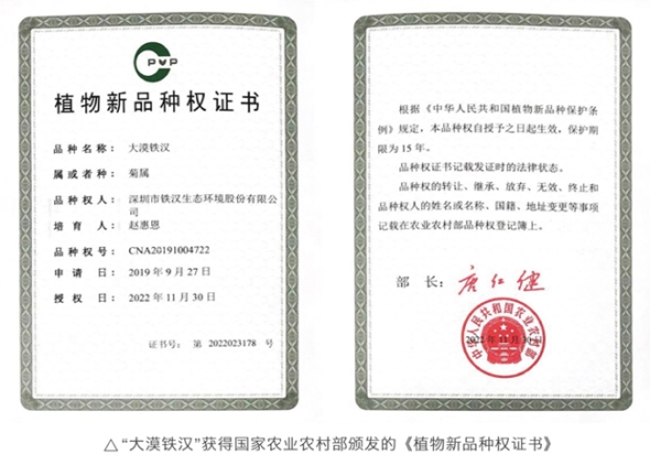 近日,中节能铁汉生态环境股份有限公司(前身为深圳市铁汉生态环境股份有限公司)培育的菊属植物“大漠铁汉”获得国家农业农村部颁发的植物新品种权证书。