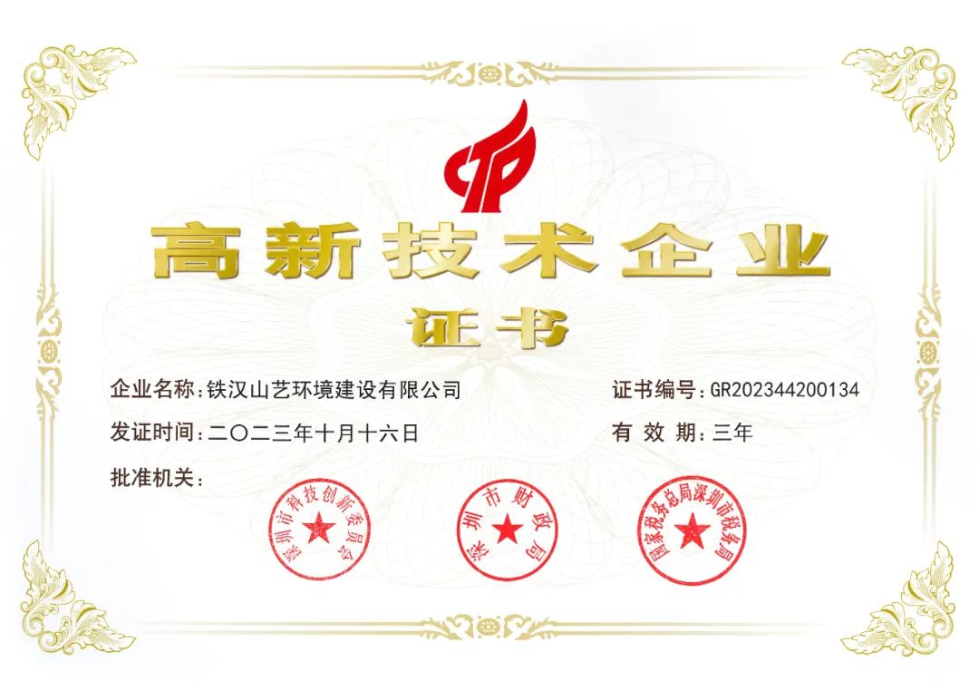 日前,全国高新技术企业认定管理工作领导小组办公室发布了《对深圳市认定机构2023年认定报备的第一批高新技术企业进行备案的公告》,经过层层评审,中节能铁汉所属铁汉山艺凭借出色的专业能力和实力,成功被认定为国家高新技术企业。这是铁汉山艺连续第三次通过国家高新技术企业认定。
