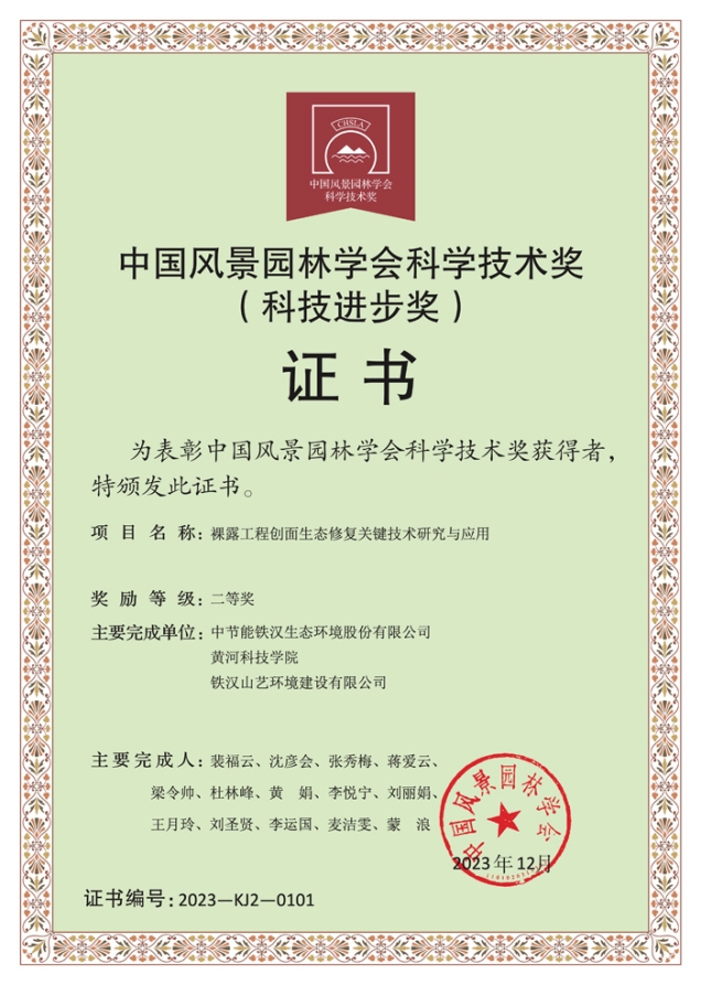面对裸露工程创面,地表生态如何修复,中节能铁汉的创新做法是——构建可持续的拟自然植被!日前,中国风景园林学会为“2023年度中国风景园林学会科学技术奖”获奖单位颁发了荣誉证书,由中节能铁汉申报的《裸露工程创面生态修复关键技术研究与应用》获科技进步奖二等奖,为该类场景生态修复提供创新解决方案。该项目去年底还揽获了2023年度广东省勘察设计行业协会科学技术奖三等奖。