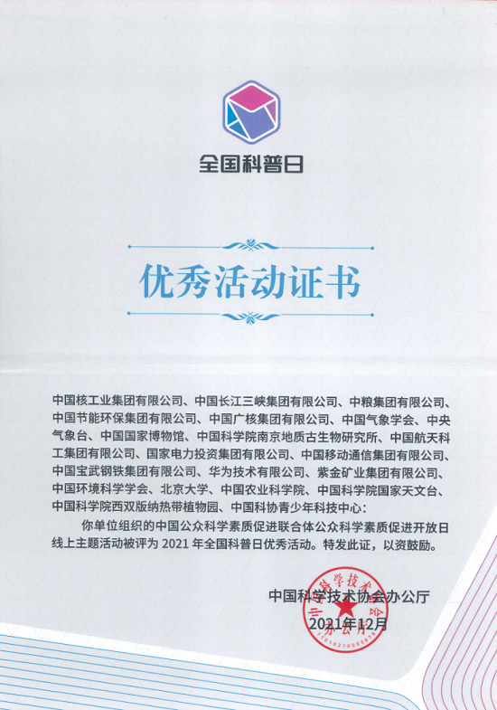 近日,本次科普宣传活动获评中国科协“2021年全国科普日优秀活动”。