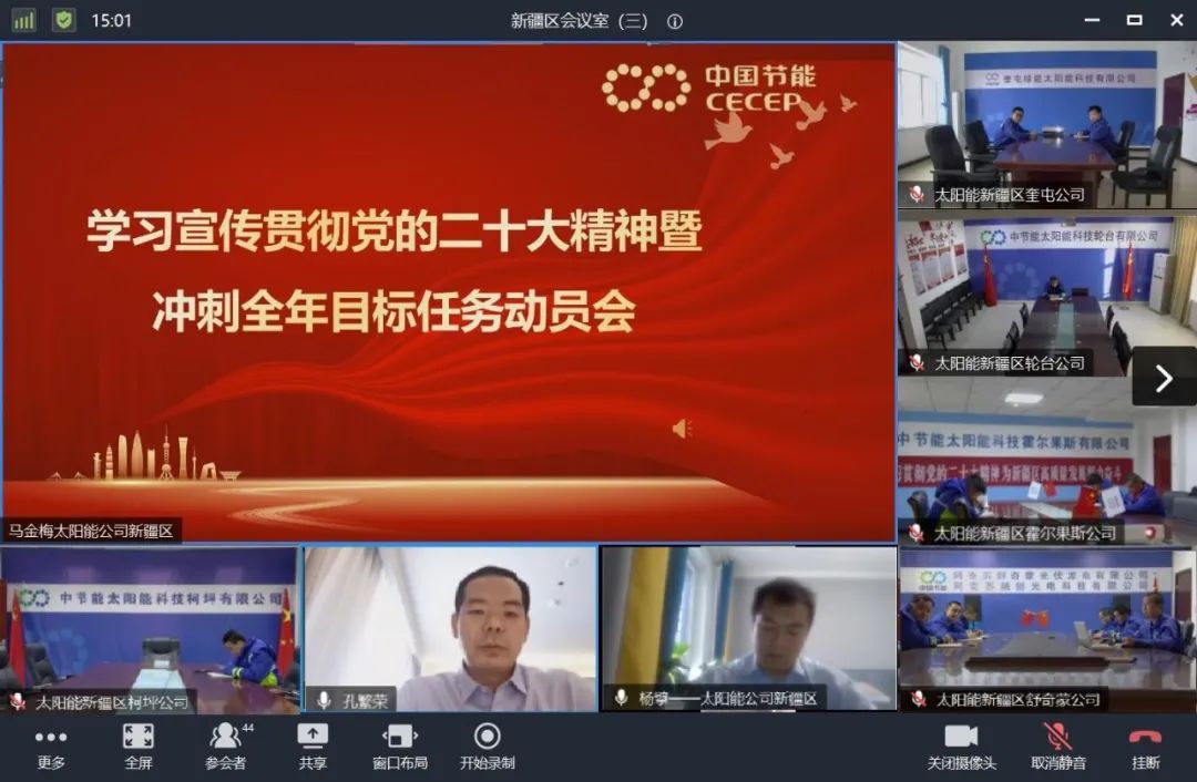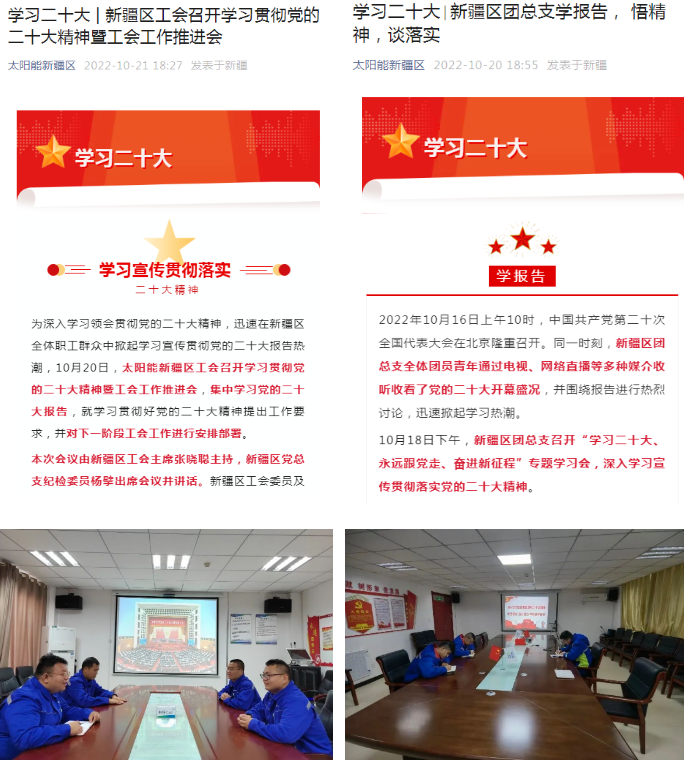 党的二十大胜利召开以来,太阳能新疆区党总支切实把思想和行动统一到党的二十大决策部署上来,迅速掀起学习宣传贯彻热潮,坚持把“为何学、怎么学、怎么做”贯穿到新疆区工作的各方面、全过程,通过领导干部带头学、层层发动广泛学、丰富载体创新学、结合实践深入学,做到学思用贯通、知信行统一,以实干实绩检验学习贯彻成效。