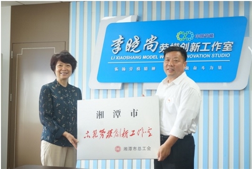 5月26日,湘潭市总工会主席徐亚健一行来到湘潭中环公司,亲自授予李晓尚劳模创新工作室“湘潭市示范劳模创新工作室”奖牌。