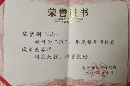 10月26日下午,浙江省第二十五个环卫工人节在杭州市举行,中国环保杭州公司HSE管理部经理陈坚刚同志被授予为“2021年度杭州市优秀城市美容师”荣誉称号。