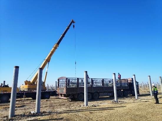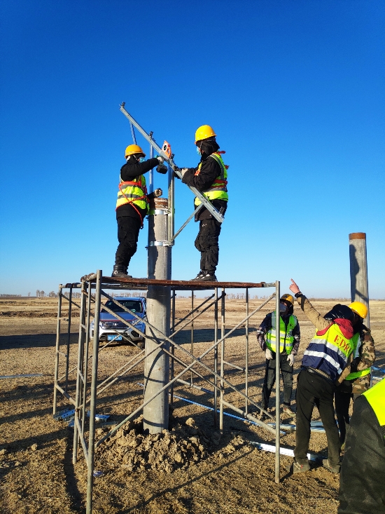 项目于2019年10月14日正式开工建设,经过260天艰苦奋战,如期并网。项目建设初期,面对工期紧张,施工条件艰苦、自然环境恶劣等不利影响,党员带头撸起袖子加油干,于2019年年底前完成了近4万根桩基础的施工和全部高压电缆沟的开挖,为项目并网奠定了前期基础。
