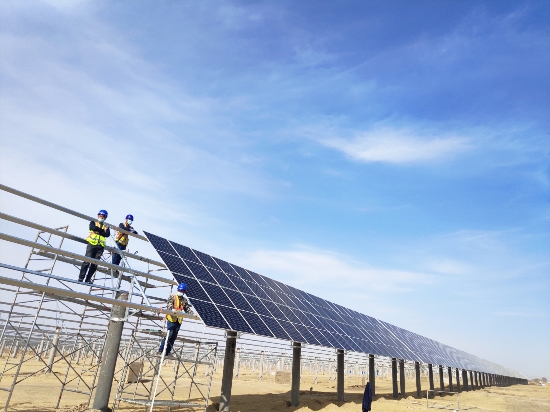 面对新冠肺炎的突然袭来,太阳能华北区党总支派驻党员驻扎现场,一手抓疫情防控,一手抓复工复产,确保电站建设不间断。项目所在地4087亩土地上留下了节能光伏人最坚实的脚印,263146块单晶双玻光伏组件上汇聚着节能光伏人的心血与汗水。