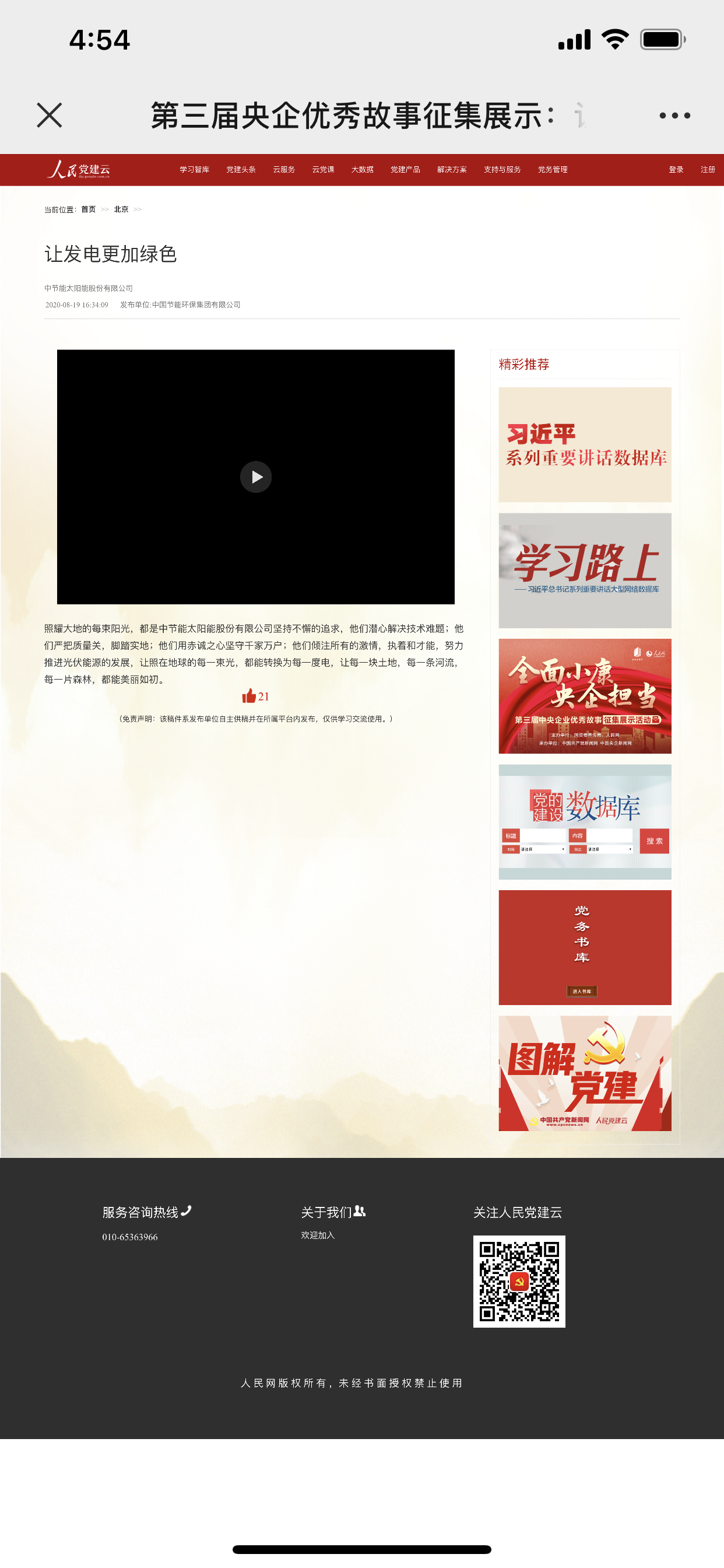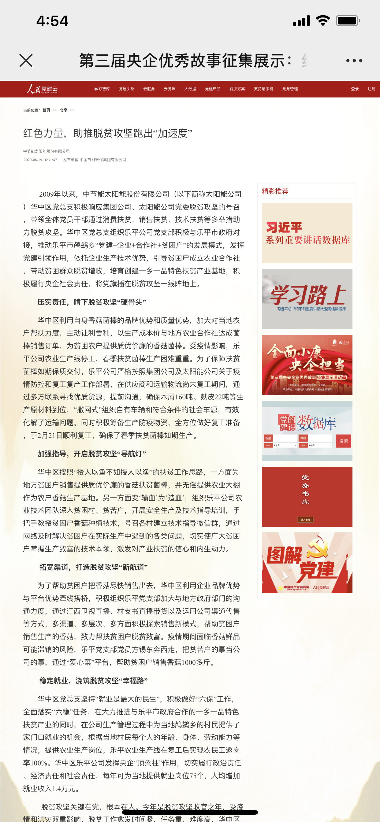 为充分展示广大中央企业在决胜全面建成小康社会、决战脱贫攻坚中的作用贡献,近日,由国资委宣传局、人民网联合主办,中国共产党新闻网、中国央企新闻网承办的“全面小康 央企担当”第三届中央企业优秀故事征集展示活动正式启动。太阳能公司共有三篇作品入选,镇江公司《让发电更加绿色》、西中区《不忘初心》、华中区《红色力量、助推脱贫攻坚跑出“加速度”》,并在国资委、人民网活动专题中展示,更有机会参与第三届中央企业优秀故事评奖。