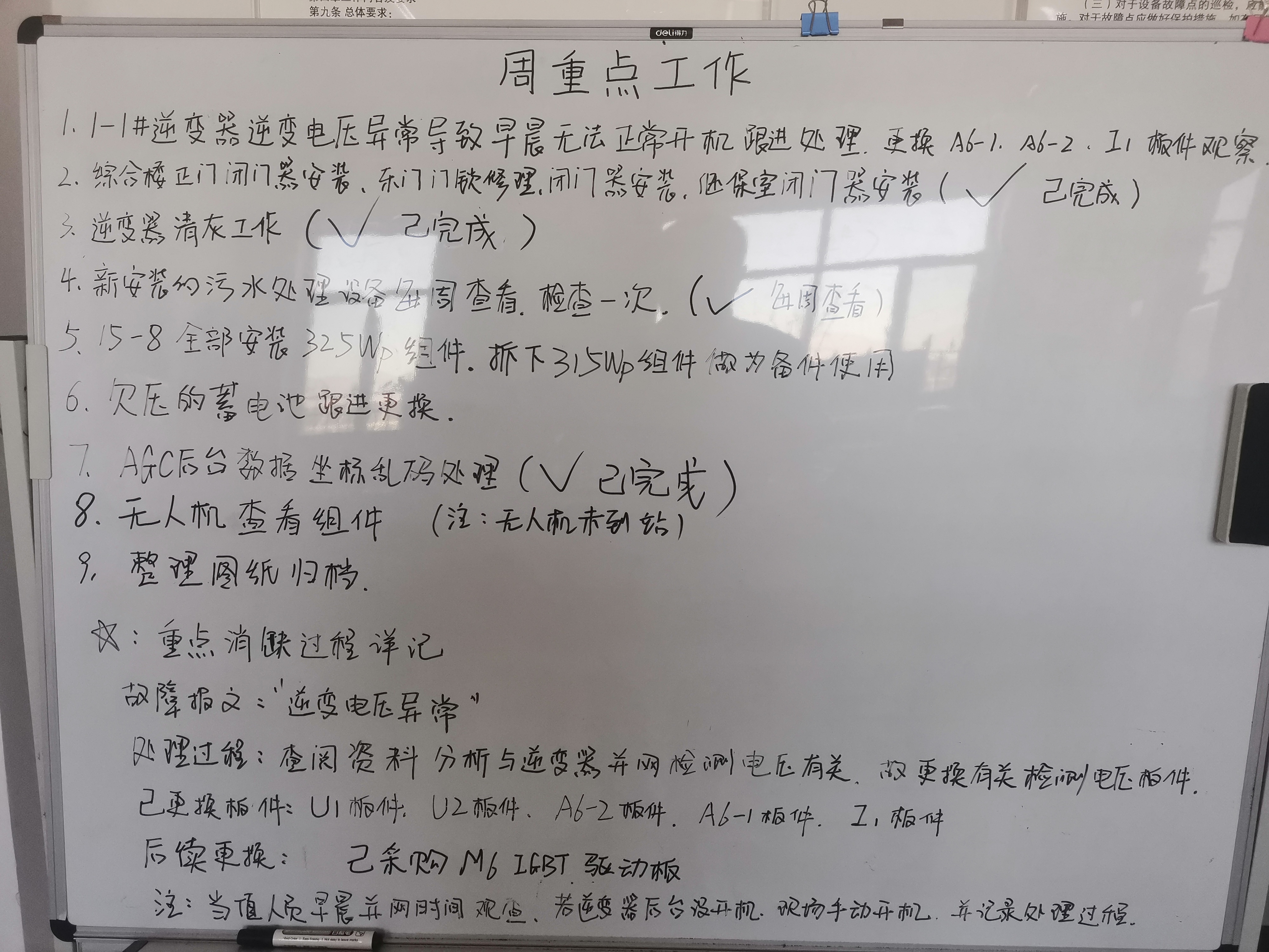 积极有效的措施,调动了员工们的工作积极性。连日来,电站SVG变压器加油,高压开关柜传动试验,继保室二次排线端子清灰紧固,逆变器、箱变专项巡检工作及电站夜巡等工作有序开展。