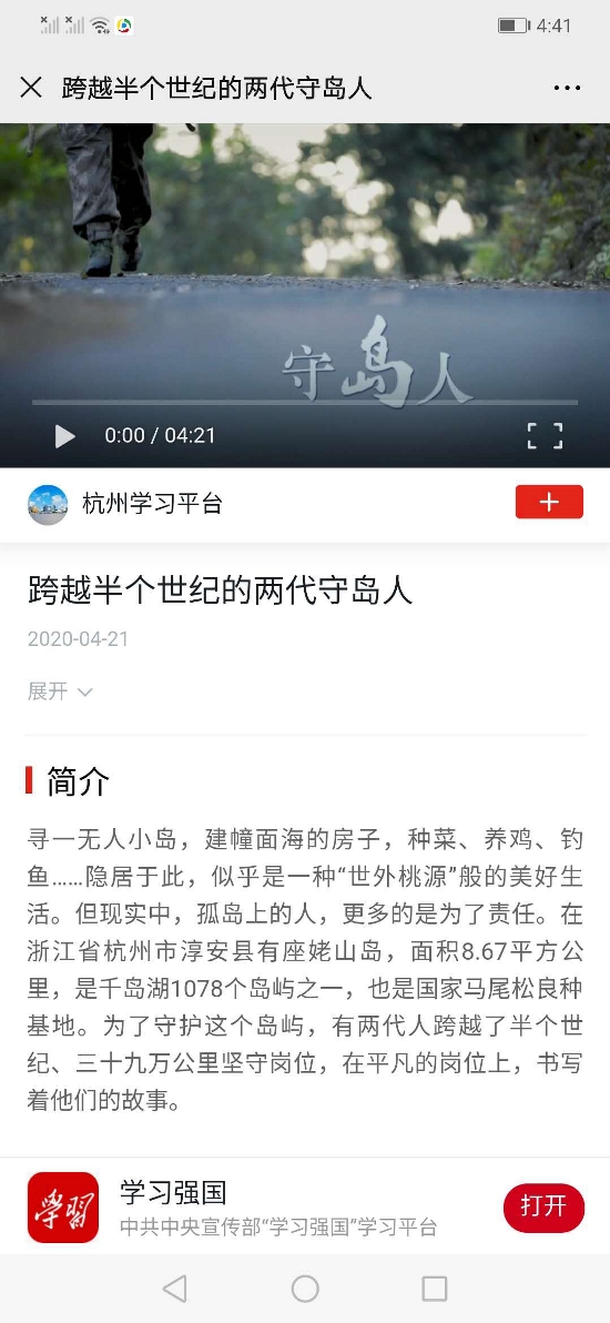 4月21日,新时代健康产业公司摄制的《跨越半个世纪的两代守岛人》宣传片登录“学习强国”平台。