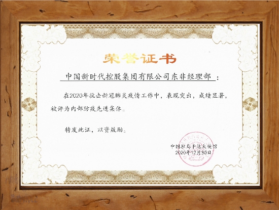 近日,中国驻乌干达大使馆对在2020年抗击新冠肺炎疫情工作表现突出的优秀单位和个人进行了表彰,新时代集团东非经理部获“内部防疫先进集体”称号。在12月底举行的乌干达中国商会在线年会上,郑大使充分肯定商会各会员单位2020年在统筹做好防疫和生产经营两项工作中所付出的努力,同时对坚决做好疫情防控工作提出了具体要求。驻乌干达大使,经商参赞,以及百余名中资企业代表出席了会议。