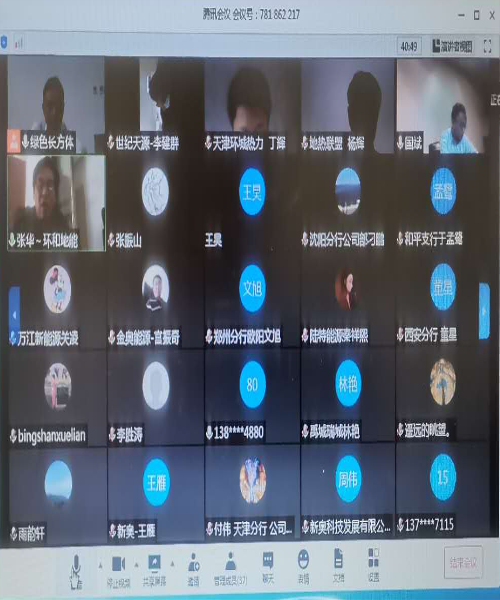 受疫情影响,银企对接会采用视频方式召开。会上,中节能咨询有限公司总经理廖原、中国地热与温泉产业技术创新联盟副秘书长杨辉致辞。华夏银行股份有限公司对其绿色金融重点产品——中国可再生能源和电池储能促进项目和京津冀大气污染防治融资创新项目,进行了全面细致的介绍。陕西中煤新能源、环合地能、天津环城热力、新奥科技、陕西金奥、浙江陆特等公司代表发言。随后,华夏银行总行业务部副总经理张勇淼与各与会企业代表就其绿色金融产品进行了充分交流。