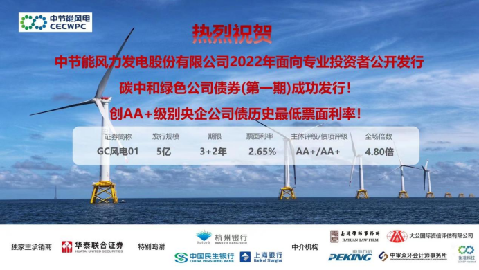 9月9日,风电公司成功簿记了2022年面向专业投资者公开发行碳中和绿色公司债券(第一期),债券简称GC风电01。本期债券发行规模为5亿元,期限为3+2年期,票面利率为2.65%,创AA+级别央企公司债历史最低票面利率。本期债券全场认购倍数为4.80倍,投资者认购意向强烈。