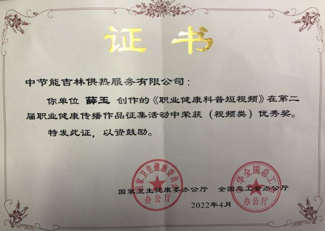 近日,从国家卫生健康委官网传来喜讯,节能科技公司下属吉林公司员工薛玉创作的——《职业健康科普短视频》,在全国第二届职业健康传播作品征集活动中荣获优秀奖。