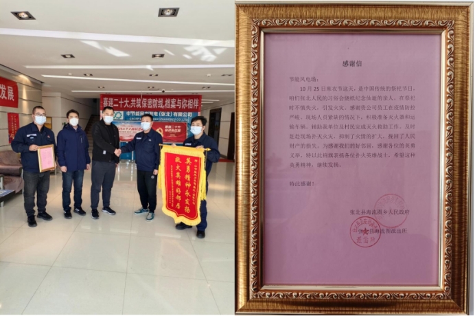 勇助驻地村民灭火。寒衣节这天,张家口张北县村民在焚烧祭祀时不慎引发火灾,导致海流图乡高家梁村山林起火,火势不断蔓延,导致附近几十亩田地及上百棵树木全部被烧。火灾无情人有情,逆行无悔显担当。满井风电场党员韩曦在听说火情后,临危不乱,发挥共产党员模范带头作用,立即组织7人“临时消防队”,赶赴现场展开救援。经过和附近村民1个多小时的共同努力,终将山火扑灭,竭尽全力保护和挽救驻地居民人身及财产安全。火灾过后,海流图乡政府及派出所有关负责人特地送来锦旗和感谢信,以此表彰满井风电场员工在疫情防控严峻、现场人员紧缺的情况下,仍不顾自身安危帮助驻地乡政府和村民灭火的英勇救助行为,在全国消防月中以实际行动诠释了节能风电人的社会责任与担当。