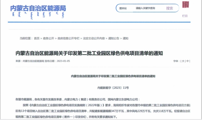 新年伊始,内蒙古自治区能源局发布《关于印发第二批工业园区绿色供电项目清单的通知》,由风电内蒙公司与乌兰察布市能源投资开发有限公司联合申报的察右前旗京蒙合作产业园(天皮山)工业园区绿色供电项目,被纳入内蒙古自治区第二批工业园区绿色供电项目清单,项目建设容量为10万千瓦。