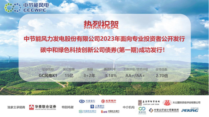 3月21日,风电公司成功簿记了2023年面向专业投资者公开发行碳中和绿色科技创新公司债券(第一期),债券简称GC风电K1。本期债券发行规模15亿元,期限为3+2年期,全场认购倍数2.70倍,票面利率为3.18%,创2023年同级别同期限无担保债券最低票面利率,获得投资者的广泛关注和热烈支持。
