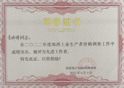 近日,风电青海公司李瑞博获得国家统计局海西调查总队“2022年度海西工业生产者价格统计调查先进个人”荣誉称号,这是青海公司员工继2018年度后再次获得此项荣誉。