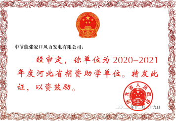 近日,风电公司所属张家口公司收到由河北省人民政府授予的“2020-2021年度河北省捐资助学单位”荣誉证书,以此表彰张家口公司对属地教育事业捐资助学工作做出的突出贡献。