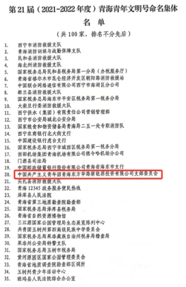 近日,第21届(2021-2022年度)青海省青年文明号集体评选结果揭晓,共青团青海东方华路新能源投资有限公司支部委员会被授予青海省青年文明号殊荣。