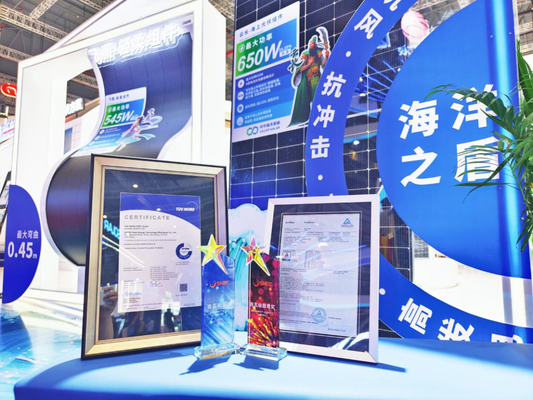会上,欧洲权威检测机构德国莱茵TÜV为太阳能公司“飞燕系列”“云长系列”组件颁发认证证书,其中“飞燕系列”组件获得国内首张柔性组件认证证书。在SNEC“十大技术亮点”评选活动中,“飞燕系列0BB N型Topcon柔性组件”“云长系列高效0BB海上光伏组件”分别获得吉瓦级金奖和兆瓦级翡翠奖。