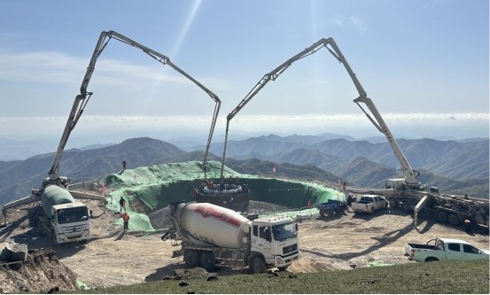 据项目负责人介绍,施工初期,项目遭遇多年罕见的雨季和进场道路政府改造施工,导致基础原材料无法及时进场;项目后期,最后3台风机的基础浇筑施工道路极其险要,羊肠山路蜿蜒入云。加上早晚的大雾、崎岖的上路,给每一趟混凝土运输带来了不小的挑战。