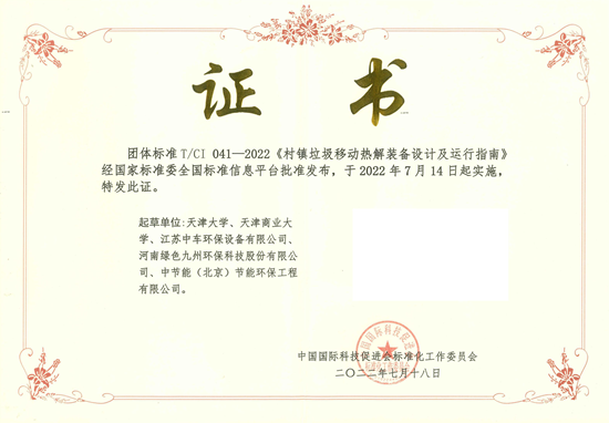 近日,由中国环保工程公司等3家单位共同编制的《村镇垃圾移动热解装备设计及运行指南》(T/CT 041-2022)团体标准,经中国国际科技促进会标准化工作委员会审批通过并正式发布实施。