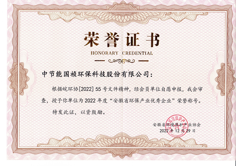 2023年1月5日,安徽省环保产业协会发布《关于发布2022年安徽环保产业优秀会员企业的公告》、《关于发布2022年安徽环保产业先进工作者的公告》,中节能国祯环保科技股份有限公司荣获“安徽省环保产业优秀企业”,同时经过审核及考察,赵郅同志和叶祥同志荣获“安徽省环保产业先进工作者”。