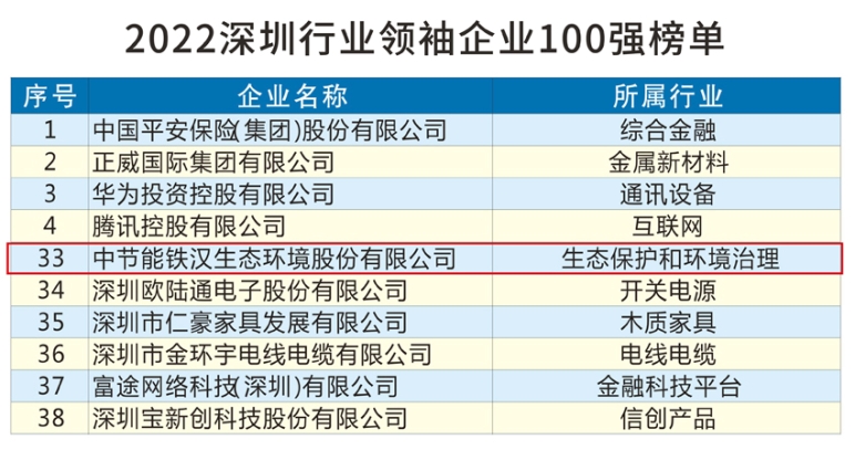 第四届“书香圳好”行业高质量发展论坛2月28日下午在深圳福田举行,活动为“2022深圳行业领袖企业100强”获奖企业颁奖。中节能铁汉作为生态保护和环境治理业龙头企业成功登榜百强榜单,位列第33名。