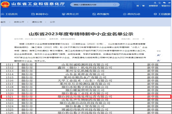 近日,山东省工业和信息化厅关于山东省2023年度专精特新中小企业名单公示,中国环保润达运营公司榜上有名,获得山东省“专精特新”中小企业称号。