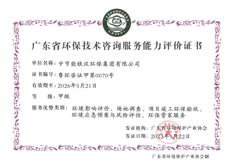 日前,中节能铁汉所属铁汉环保通过了广东省环境保护产业协会审核,顺利取得《广东省环保技术咨询服务能力评价证书》,成为2023年第一批广东省环保技术咨询服务能力评价甲级证书单位。
