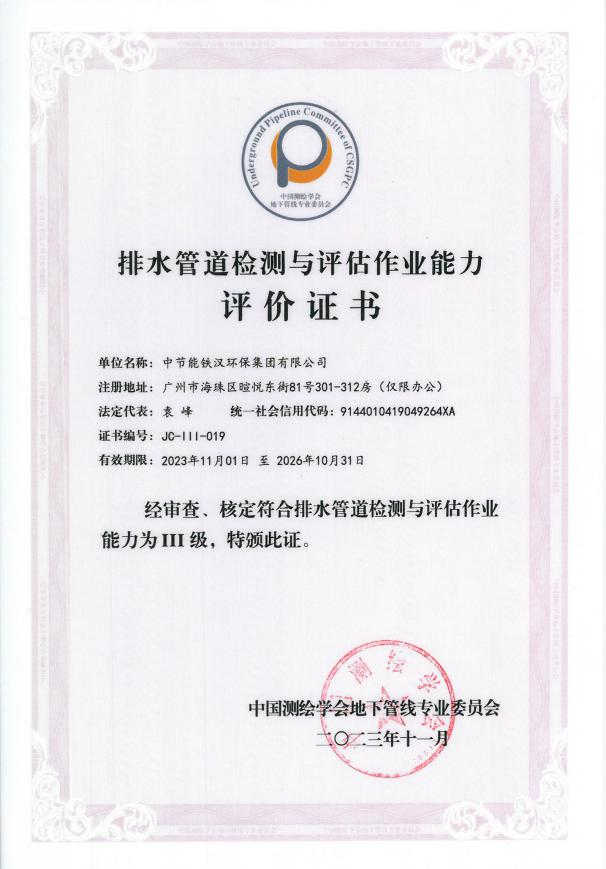 近日,经中国测绘学会地下管线专业委员会评审,中节能铁汉所属铁汉环保荣获《排水管道检测与评估作业能力评价证书》,标志着企业业务范围得到进一步拓展。