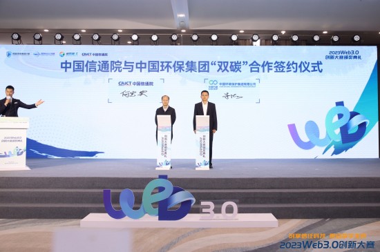 12月7日,在由可信区块链推进计划、香港Web3.0协会联合主办的2023 Web3.0创新大赛暨颁奖典礼上,中国环保副总经理朱浩、信通院云计算与大数据研究所所长何宝宏分别代表中国环保和中国信通院共同签署“双碳领域框架合作协议”。