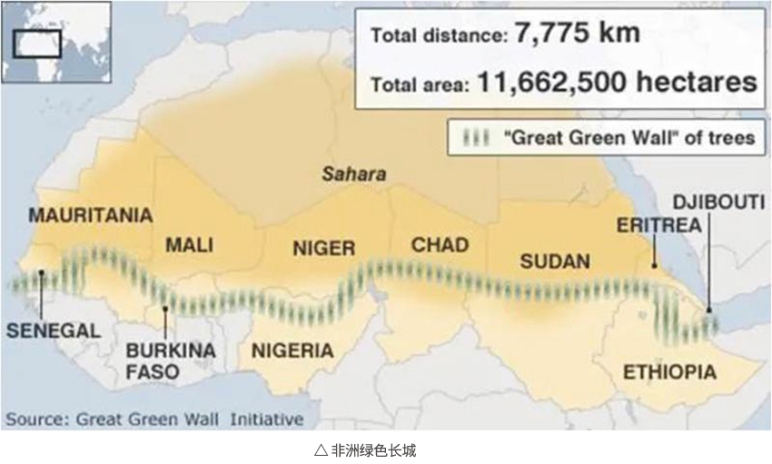 “非洲绿色长城”是2007年经非洲联盟决议的一项泛非植被屏障倡议,涵盖了撒哈拉沙漠北部和南部所有的干旱与半干旱区,核心区域面积为7.8亿公顷,涉及2.32亿人口,现已成为非洲经济社会的“绿色屏障”,被称之为“非洲准备面对未来的象征”。