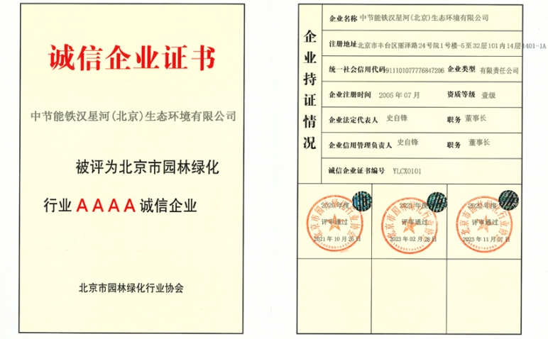 近日,经北京市园林绿化行业协会评定,中节能铁汉所属铁汉星河取得4A等级“诚信企业”认证。自2014年以来,铁汉星河连续九年获此殊荣,以实力赢得行业和社会的持续认可。