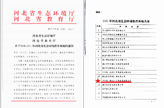 2021年12月24日,中国环保衡水公司又迎来了河北省生态环境厅和河北省教育厅联合授予的2021年“河北省生态环境教育基地”的荣誉称号。