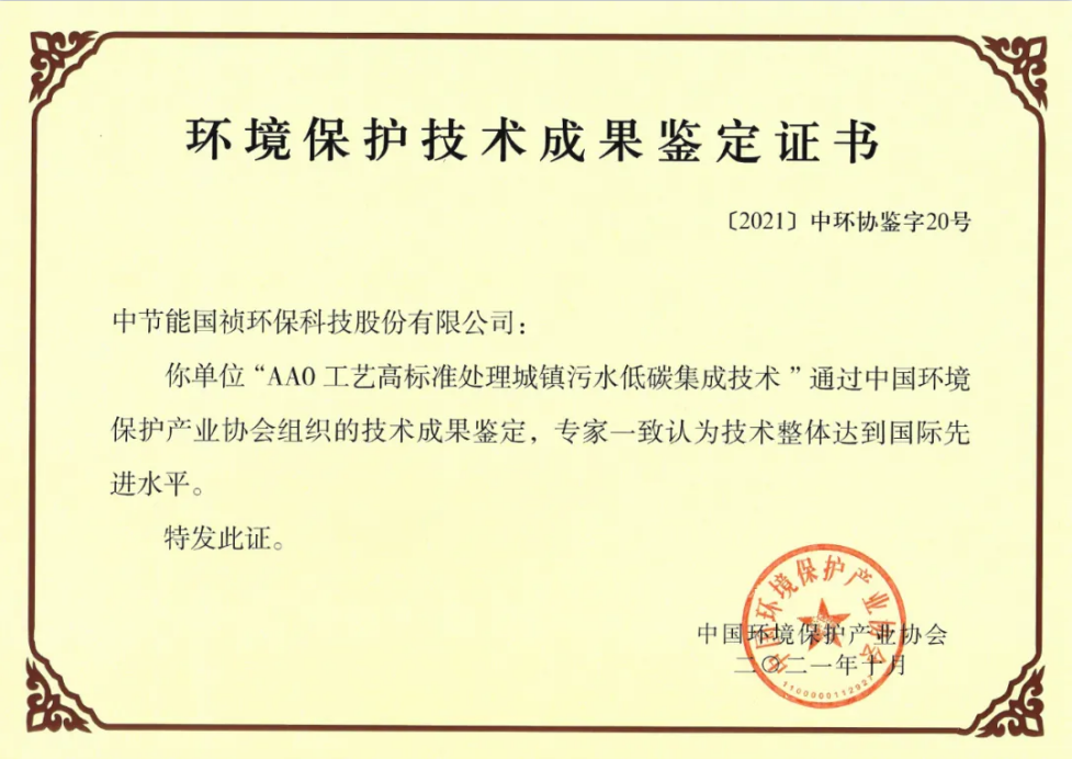 近日,中节能国祯“AAO工艺高标准处理城镇污水低碳集成技术”获中国环境保护技术成果鉴定证书,经鉴定委员会专家评估,一致认定该技术达到国际先进水平。