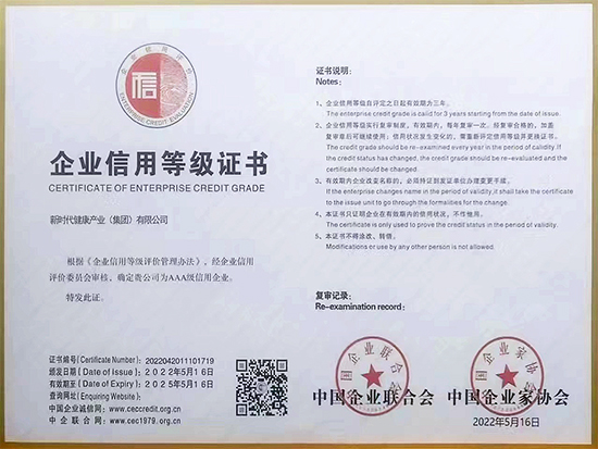 近日,中国企业联合会、中国企业家协会(以下简称“中国企联”)发布了2022年信用企业名单。新时代健康产业(集团)有限公司(简称健康产业公司)凭借过硬的经营管理水平,获评企业信用最高等级“AAA级信用企业”称号,标志着健康产业公司的服务能力、产品质量、管理水平和信誉程度得到社会公认。