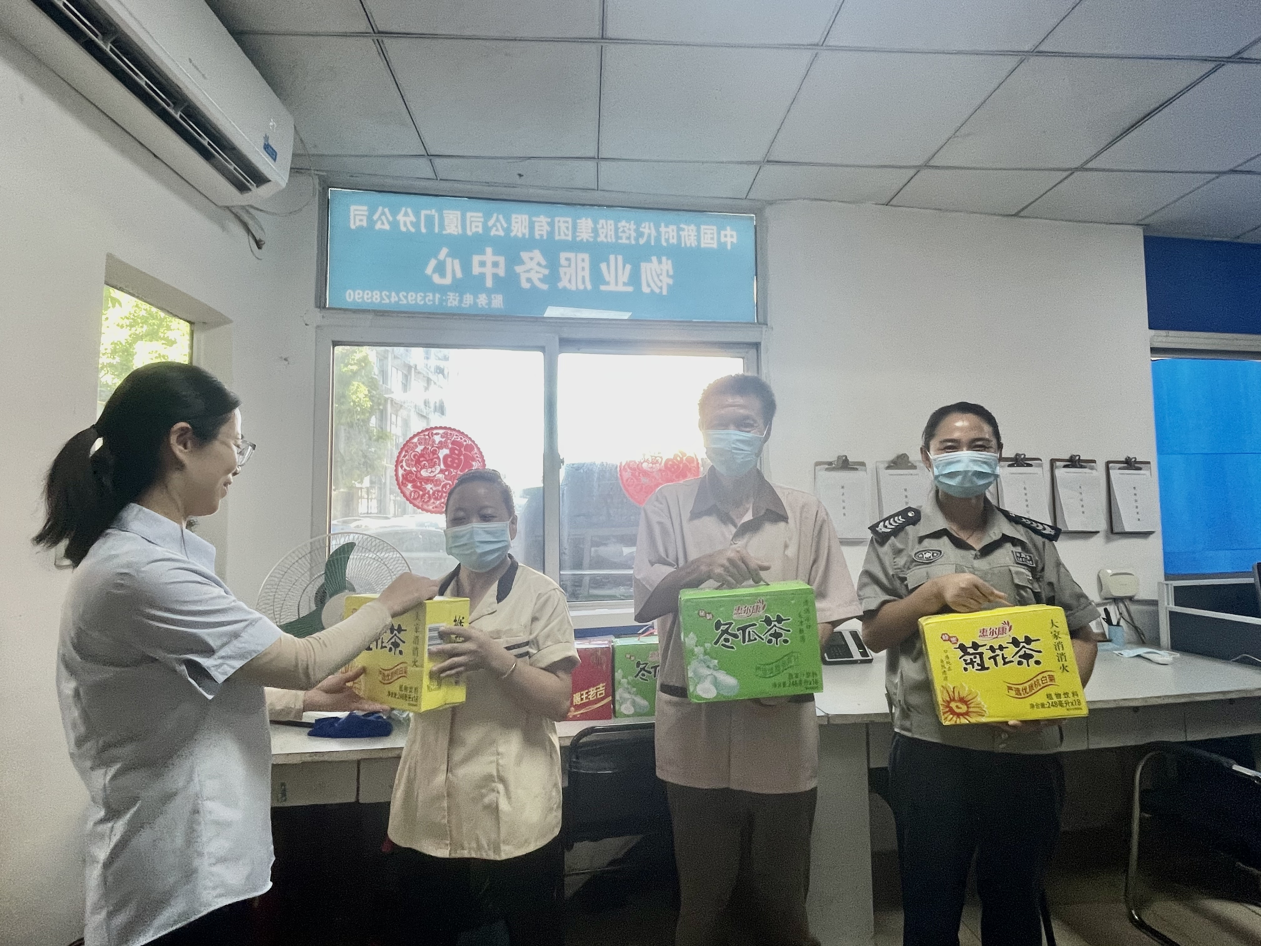 新时代集团为保护广大一线职工身体健康,保障企业生产安全,通过加强防暑安全知识宣传、创建安全健康工作环境、走访慰问发放防暑用品等多种方式,切实做好高温暑期对一线职工的服务和保障工作。在北京花园路新时代大厦大厅大屏幕滚动播放“高温防护、中暑急救”等卫生知识宣传片,有效提升了职工和业主安全防暑意识和能力,厦门新时代大厦开辟午间休息室、配备电风扇,切实解决一线保洁员与安保员高温工作的困难和需求,深圳华联发大厦坚持熬制绿豆汤发放到各基层一线岗位,为职工安全、安心工作创造条件。各级工会还结合“央企消费帮扶兴农周”活动,从帮扶平台选购了菊花茶、绿豆、冰糖等种类丰富的防暑降温食品发放到职工手中,为大家带去一丝清凉,也把组织的关怀送到一线职工心坎上。