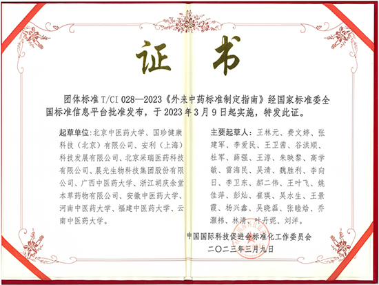 日前,健康产业公司与北京中医药大学等机构联合起草的团体标准T/CI028—2023《外来中药标准制定指南》,经国家标准委全国标准信息平台批准发布,正式颁布实施。