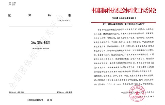 日前,健康产业公司国珍健康研究院联合中国保健协会食物营养与安全专业委员会等起草的《DHA藻油制品》团体标准(T/CI 151-2023),经中国国际科技促进会标准化工作委员会审批通过,正式颁布实施。